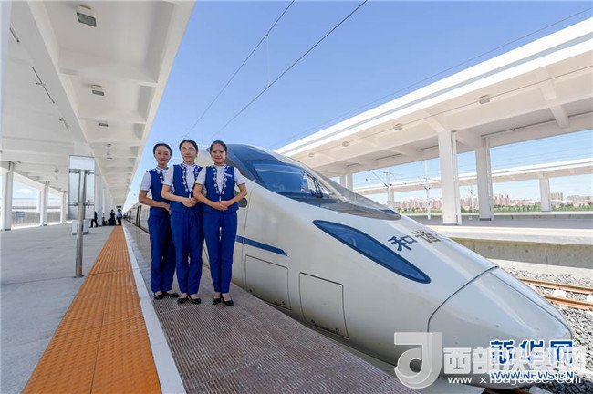 乘務(wù)組人員在烏蘭察布站與動(dòng)車(chē)組合影(8月3日攝)。8月3日,內(nèi)蒙古首列高鐵D6980次列車(chē)伴隨著嘹亮的汽笛聲,駛出呼和浩特東火車(chē)站,以250公里的時(shí)速駛向?yàn)跆m察布站,內(nèi)蒙古自此正式邁進(jìn)高鐵時(shí)代。