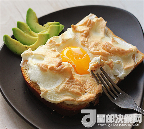 4.用刮刀把蛋白霜涂抹到土司上,不用抹平,中間留個(gè)小坑,蛋黃放中間,就用一個(gè)雞蛋,只有一個(gè)蛋黃。