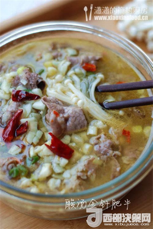 我在網(wǎng)上查了查,酸湯金針肥牛的做法有很多種,但我喜歡的這種突出金湯的特點:湯清澈而呈金黃色,酸得爽口利落,留在舌尖的感覺沒有一般肉菜帶來的滯膩感,倒是有一種清爽的回味。