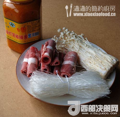 肥牛片一盒、金針菇400克、綠豆粉絲一扎。