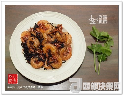 傳統(tǒng)的茶香蝦,蝦要炸得酥脆的,茶葉也是要炸得酥脆的,自家吃的還是講究少油健康,茶葉改為炒的,但還是一樣的好吃,蝦是外酥里嫩。兒子表揚我做蝦的手藝已經(jīng)超越了許多餐廳。