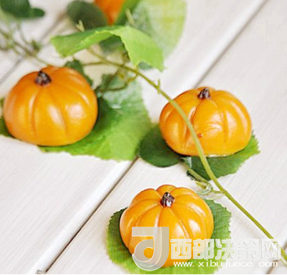 5、用刀背在圓球上按壓上一條溝。依次,在上面均分按壓四條;小南瓜就做好了,簡單吧!