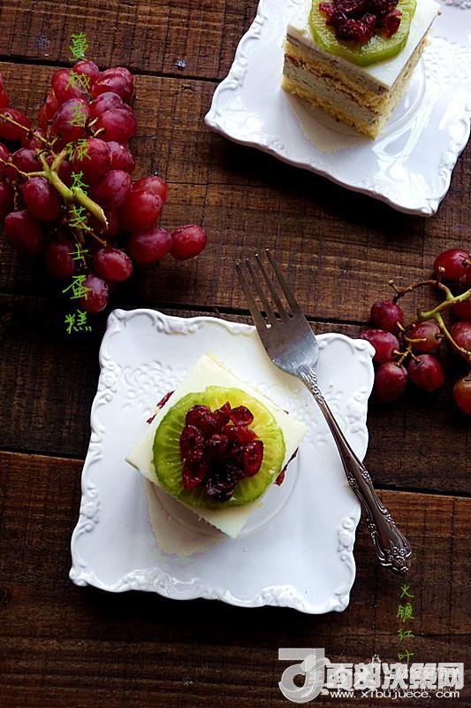 18蛋糕脫模切件,加放個(gè)人喜愛的水果片在蛋糕上,撒上用果汁泡軟的蔓越莓,即可食用