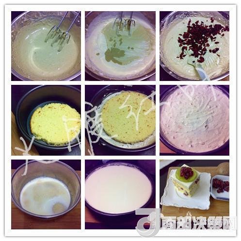 14倒入蔓越莓芝士材料再放一片蛋糕片