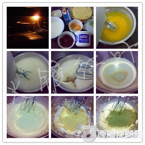 蔓越莓, 馬斯卡彭奶酪250克,蛋黃2個(gè),檸檬汁5克,糖60克,牛奶100克,綠茶粉20