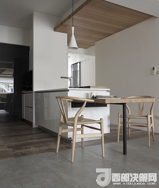 將洗手臺放在中間的位置,配上組合的簡易餐桌,不做吧臺的設計也能滿足開放式的需求,在家下廚較少的業(yè)主可以考慮。