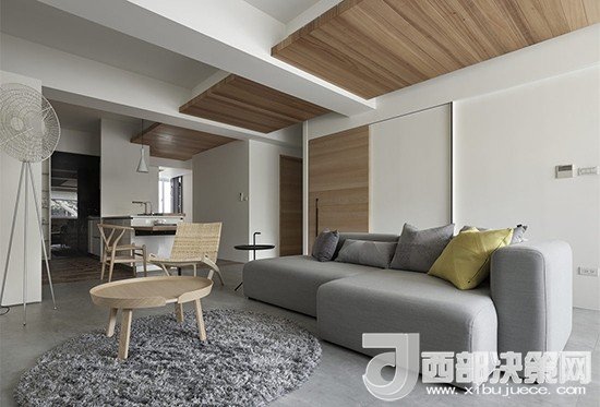 為了符合簡單純粹的設計理念,沒有電視柜的背景墻上放置了一個藝術(shù)時鐘,可移動的數(shù)字設計展現(xiàn)了一種道家的精神。