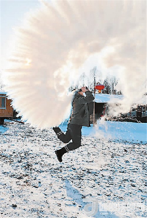 圖為一名男子嘗試“潑水成冰”。(記者 李任滋 攝)