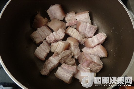 3.鍋內(nèi)不放油燒熱,把肉切塊后放入