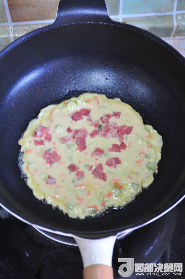 主料:胡蘿卜 10克 青椒 10克 培根 1片 雞蛋 50克 包菜 10克 面粉 40克