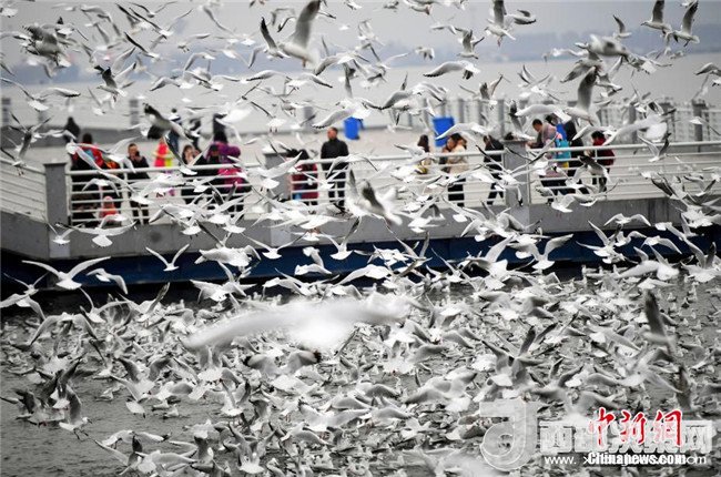 2月4日,人們穿著厚厚的冬裝在昆明滇池邊給紅嘴鷗喂食。當(dāng)日,受較強冷空氣影響,“春城”昆明最低氣溫下降至-3℃。天氣雖然寒冷,卻抵擋不住市民和游客前來滇池觀賞、喂食越冬紅嘴鷗的熱情。中新社記者李進(jìn)紅攝