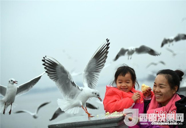 2月4日,一名女孩穿著厚厚的冬裝在昆明滇池邊給紅嘴鷗喂食。當(dāng)日,受較強冷空氣影響,“春城”昆明最低氣溫下降至-3℃。天氣雖然寒冷,卻抵擋不住市民和游客前來滇池觀賞、喂食越冬紅嘴鷗的熱情。中新社記者李進(jìn)紅攝