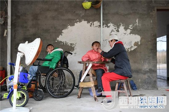 饒梅香代養(yǎng)的三個孩子在屋外曬太陽(2月14日攝)。