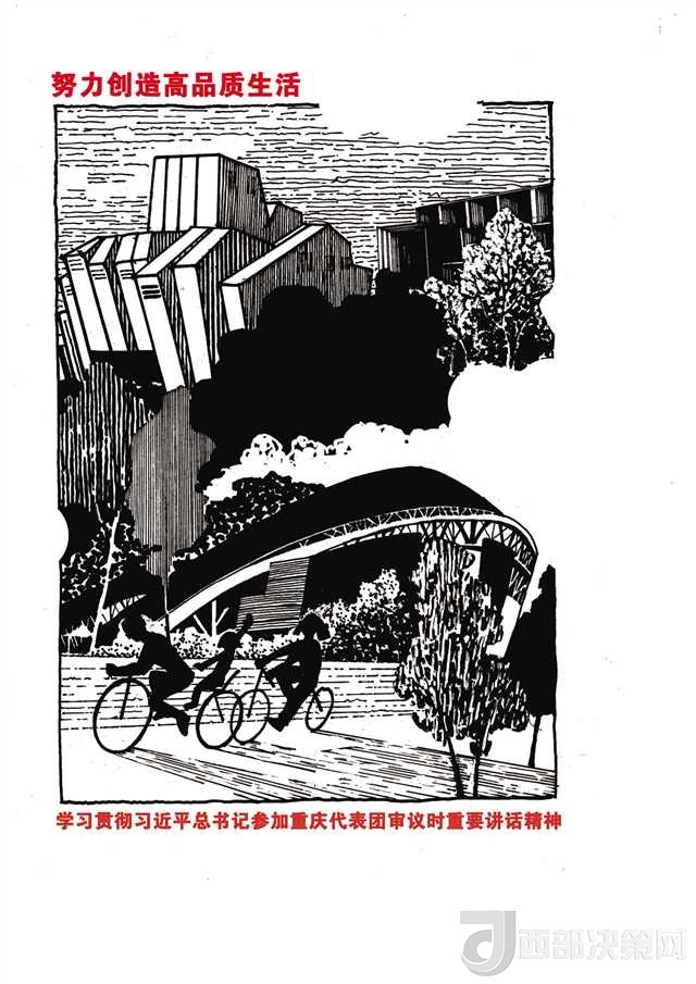 另一組負責“創(chuàng)造高品質(zhì)生活”的師生也遭遇類似的問題。最初師生們想用一組市民在公園鍛煉的場景來闡述這個主題,但很快就發(fā)現(xiàn)這樣的畫面太簡單蒼白。最終,他們將重慶大劇院、重慶美術(shù)館、奧體中心等重慶的標志性建筑作為文化符號列入畫稿中,才有了令人耳目一新的感覺。