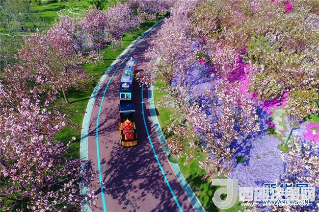 4月8日,觀光小火車行駛在江蘇南通洲際綠博園。