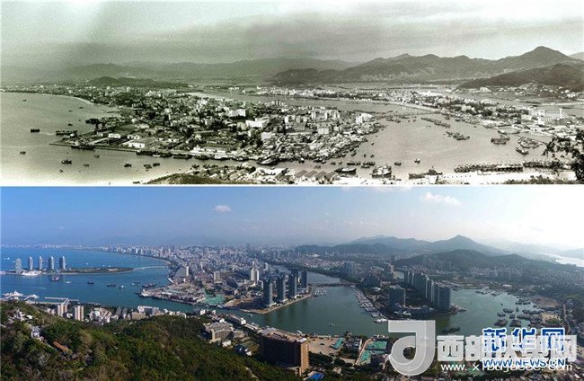 拼版照片為在三亞市鹿回頭景區(qū)鳥(niǎo)瞰三亞市景今昔對(duì)比(上圖為1991年2月新華社記者姜恩宇攝,下圖為2018年4月4日新華社記者郭程攝)。