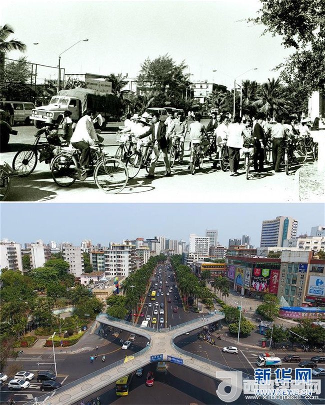 拼版照片為海口市海府路今昔對(duì)比(上圖為1988年12月新華社記者姜恩宇攝,下圖為2018年4月14日新華社記者郭程攝)。