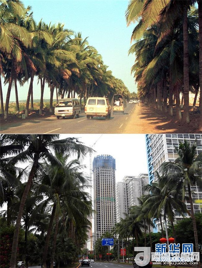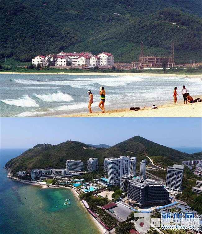 拼版照片為三亞市亞龍灣今昔對(duì)比(上圖為1998年新華社記者姜恩宇攝,下圖為2018年4月4日新華社記者郭程攝)。