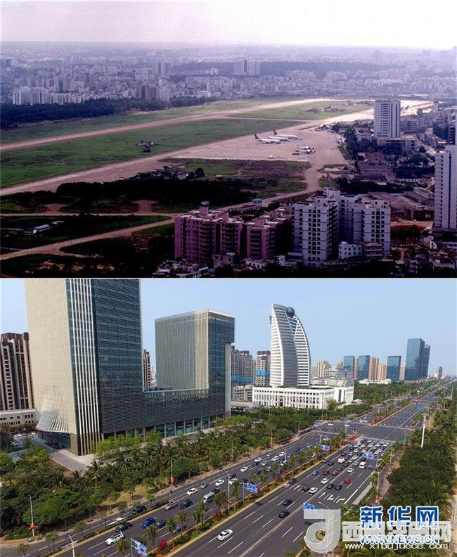 拼版照片為海口市濱海大道南側(cè)的建筑物今昔對(duì)比(上圖為1990年1月10日新華社記者姜恩宇攝,下圖為2018年4月15日新華社記者趙穎全攝)。