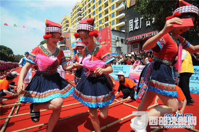 4月18日,在廣西上思縣舉行的“三月三”民俗風(fēng)情節(jié)上,少數(shù)民族同胞在跳竹竿舞。新華社發(fā)(梁富盈 攝)