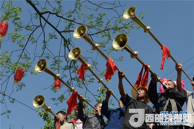 4月18日,在湖南省吉首市丹青鎮(zhèn)錦坪村,人們在“三月三”盛會上吹奏甲馬號。新華社發(fā)(姚方 攝)