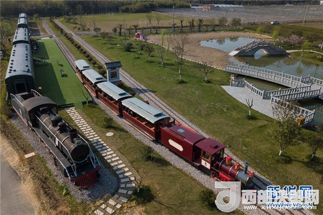 游客乘坐觀光小火車從浙江省安吉縣魯家村的休閑驛站邊駛過(3月23日無人機(jī)拍攝)。