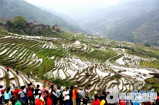 4月30日,游客在廣西龍勝龍脊古壯寨觀賞梯田美景。新華社發(fā)(王滋創(chuàng)攝)