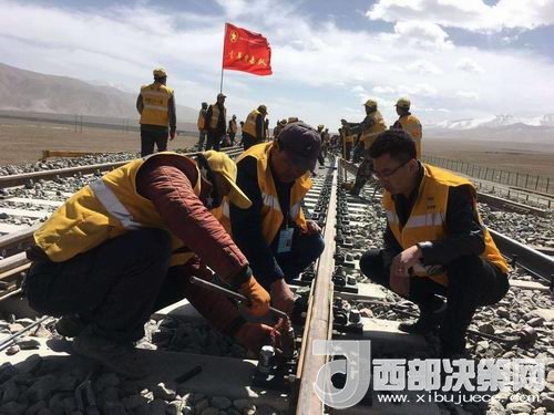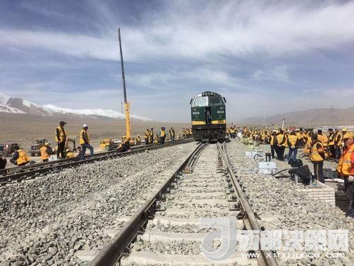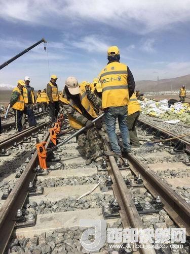 在玉珠峰車(chē)站施工現(xiàn)場(chǎng),600余名工人正在緊張的進(jìn)行螺紋道釘錨固定、搗道石、安裝枕木連接板等操作。橘黃色的工作服在遠(yuǎn)處皚皚雪山的映照下分外醒目和溫暖。中鐵二十一局格拉擴(kuò)能改造工程指揮部總工李先告訴記者:“這個(gè)車(chē)站的改造由車(chē)站北側(cè)增加2條到發(fā)線,在車(chē)站的西側(cè)增加3股道的專(zhuān)用裝卸線。涉及到路基、橋涵、房建、軌道、通信、信號(hào)、電力7個(gè)專(zhuān)業(yè)。”