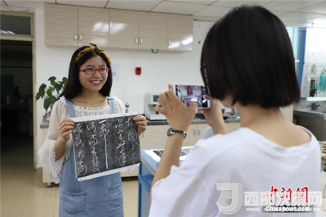 6月9日,一位女同學(xué)與自己的拓片作品合影。當(dāng)日,貴州省古籍保護(hù)中心在貴州省圖書館舉辦“古籍修復(fù)技藝體驗(yàn)”活動(dòng)?;顒?dòng)開展了古籍修復(fù)、碑文傳拓等技藝體驗(yàn)。眾多高校師生和民眾紛紛前往體驗(yàn)。中新社發(fā)瞿宏倫攝