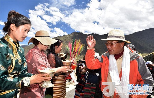 6月18日,嘎沖村群眾(左)向來自遠方的新鄰居敬獻青稞酒。