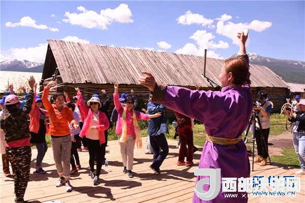 游客在喀納斯景區(qū)向當(dāng)?shù)厣贁?shù)民族學(xué)習(xí)舞蹈(6月24日攝)。
