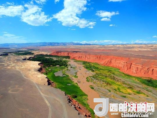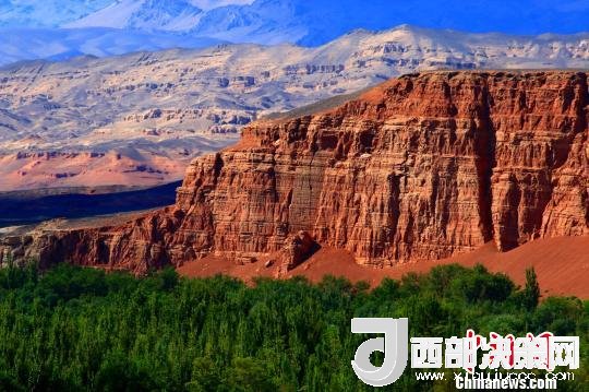 站在天山紅河谷入口處的斷崖邊,可以清晰地看到遠(yuǎn)處的天山,天然的紅土飄帶,一簇簇的綠蔭,坐落有致的農(nóng)家院落。荒涼的戈壁與斷崖下的美景,給人以強(qiáng)烈的視覺沖擊。紅色的山巖,猶如一條鑲嵌在天際間的飄帶而光彩奪目,河谷內(nèi)寧靜的村莊透露著幾分神秘。