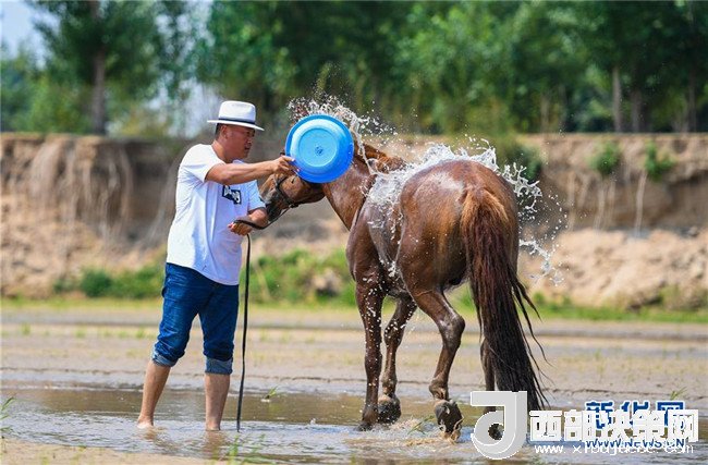 呼日查畢力格為馬洗澡(7月21日攝)。新華社記者彭源攝