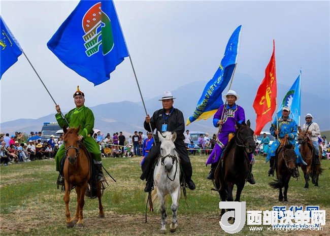 呼日查畢力格(左二)在赤峰市巴林左旗那達慕上騎馬出場(7月19日攝)。新華社記者彭源攝