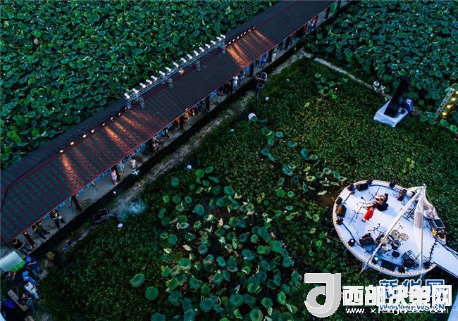 樂隊(duì)組合在浙江省建德市大慈巖鎮(zhèn)里葉村荷田間的舞臺(tái)上進(jìn)行演奏(7月14日無人機(jī)拍攝)。新華社記者 徐昱 攝