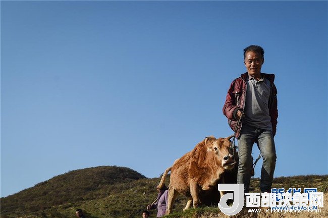 貴州畢節(jié)市七星關區(qū)長春堡鎮(zhèn)埡關村農(nóng)民張祥印在放牛(2015年11月14日攝)。張祥印是當?shù)氐呢毨?,年均純收入只有一千多元?015年,七星關區(qū)推出精準扶貧套餐,張祥印選擇了養(yǎng)牛,走上脫貧致富之路。新華社記者 歐東衢 攝