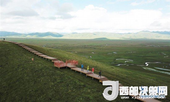 游客在瑪曲縣阿萬倉濕地的觀景步道上游覽(7月31日無人機拍攝)。新華社記者 陳斌 攝