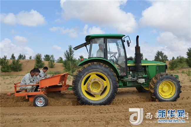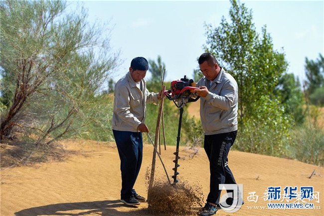 億利集團(tuán)生態(tài)事業(yè)部職工在庫(kù)布其沙漠中利用螺旋鉆孔植樹法種樹(7月11日攝)。用這種方法30秒可種下一棵樹。 新華社記者 彭源 攝