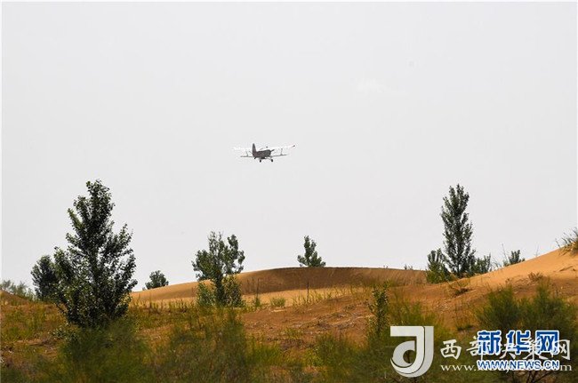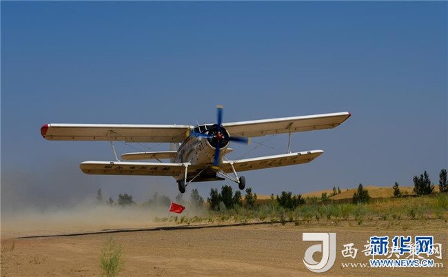 在內(nèi)蒙古鄂爾多斯市的庫(kù)布其沙漠腹地,一架飛播造林用的飛機(jī)起飛(7月11日攝)。 新華社記者 彭源 攝