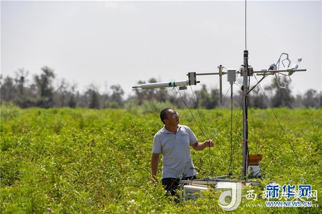 在內(nèi)蒙古鄂爾多斯市的庫(kù)布其沙漠中的億利集團(tuán)阿木古龍甘草健康產(chǎn)業(yè)園,工作人員在儀器前觀測(cè)氣候土壤條件(7月11日攝)。 新華社記者 彭源 攝