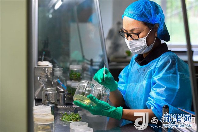 在億利集團(tuán)庫(kù)布其生態(tài)科技中心的沙生植物育苗實(shí)驗(yàn)室內(nèi),科研人員進(jìn)行組培試驗(yàn)(7月11日攝)。 新華社記者 彭源 攝