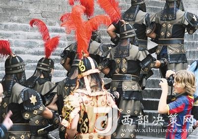 外國(guó)游客被威武的城墻武士所吸引。