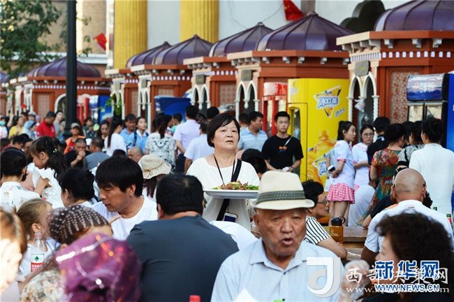 8月18日,游客在烏魯木齊二道橋大巴扎步行街品嘗美食。