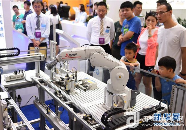 觀眾在2018世界機(jī)器人大會(huì)上參觀一款工業(yè)機(jī)器人(8月15日攝)。 新華社記者 張晨霖 攝
