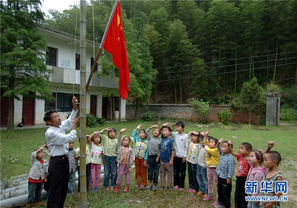 9月4日,在蘆嶺教學點,陳云根(后)和黃文春(前)帶著全校6名學生升國旗?,F(xiàn)在學校操場已經(jīng)鋪上了水泥。新華社記者 宋振平 攝