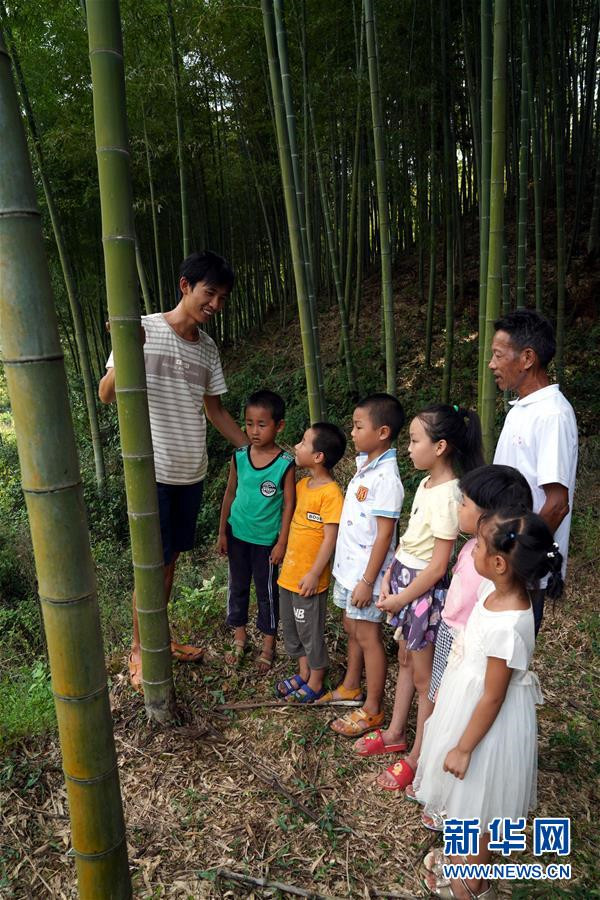 9月4日,黃文春(左一)和陳云根帶著學生們來到學校附近的山林,為孩子們講解竹子的生長過程。 新華社記者 汪明麗 攝