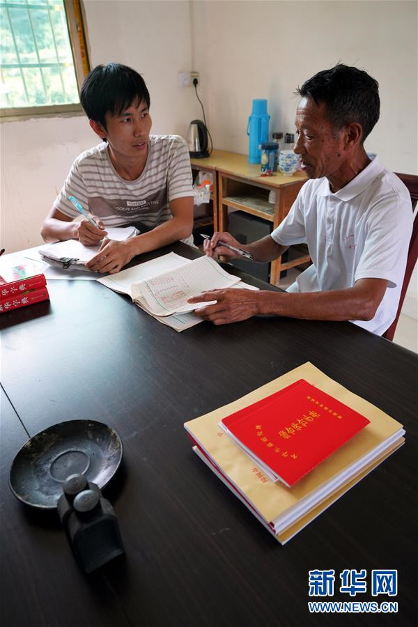 9月4日,在蘆嶺教學點,陳云根(右)與黃文春探討新學期教學計劃。 新華社記者 宋振平 攝