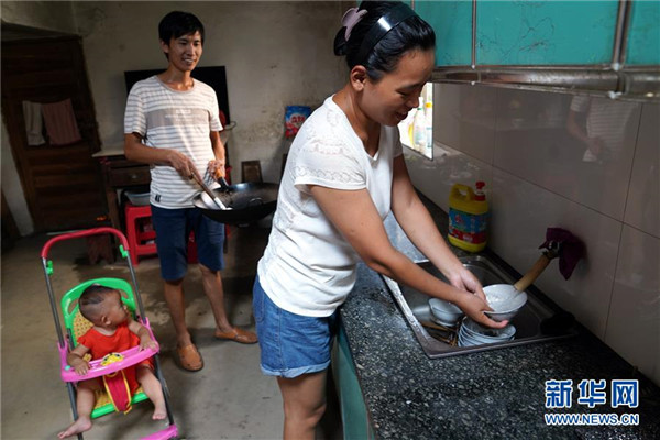 9月4日,在黃文春家中,黃文春和妻子歐陽沙在廚房做飯。黃文春2011年與同學歐陽沙結(jié)婚后,就把根扎在了蘆嶺,幾次放棄了考試進城教書的機會。 新華社記者 宋振平 攝