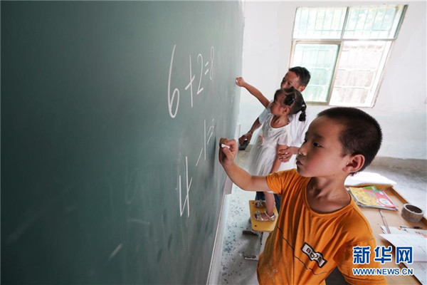 9月4日,在蘆嶺教學點,陳云根在課堂上帶著孩子們做習題。 新華社記者 宋振平 攝