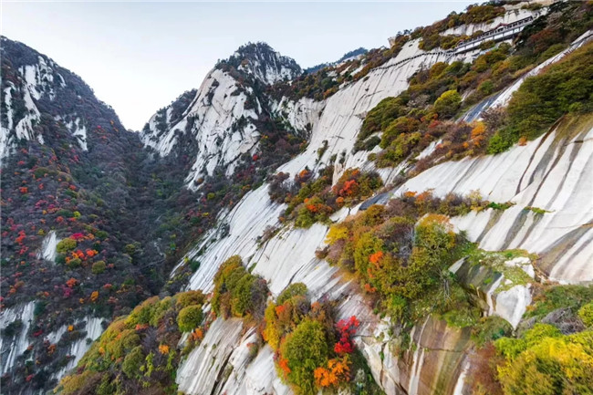 千尺幢、百尺峽、老君犁溝,這些華山著名的景點(diǎn),在不同角度、不同時(shí)刻都展示著不一樣的紅葉流動(dòng)。